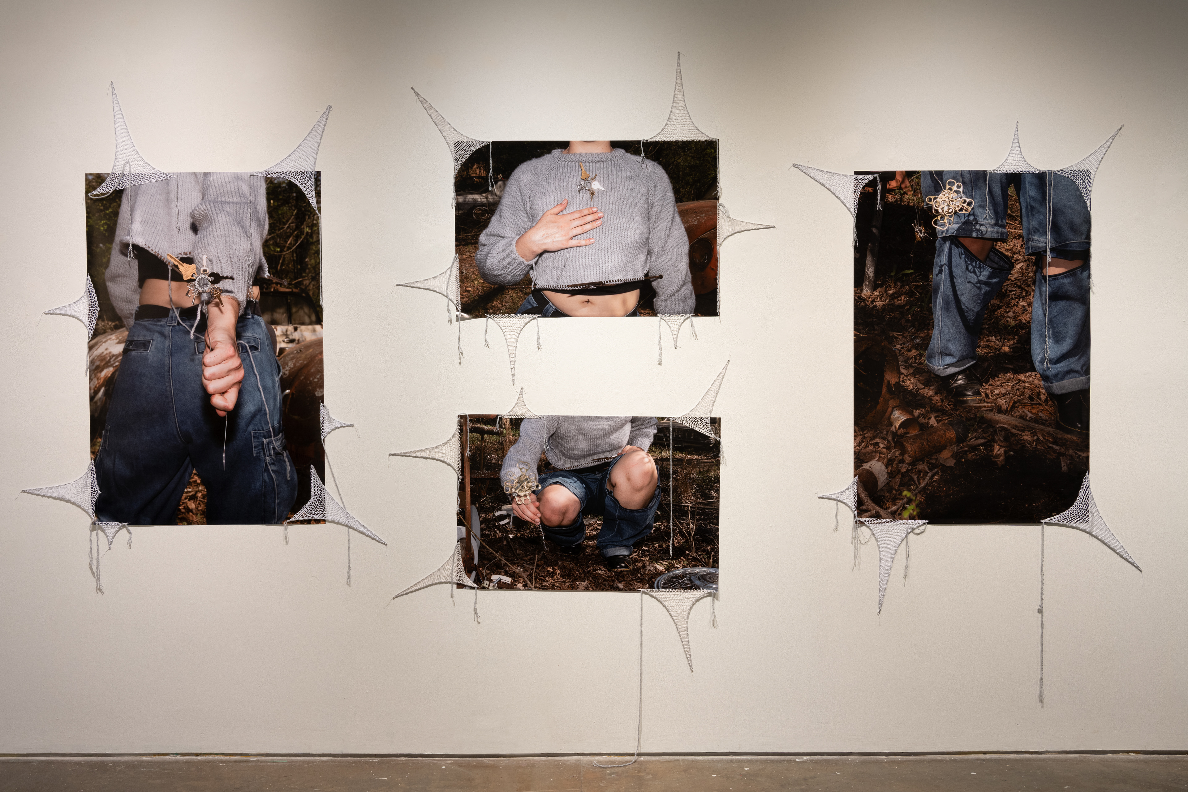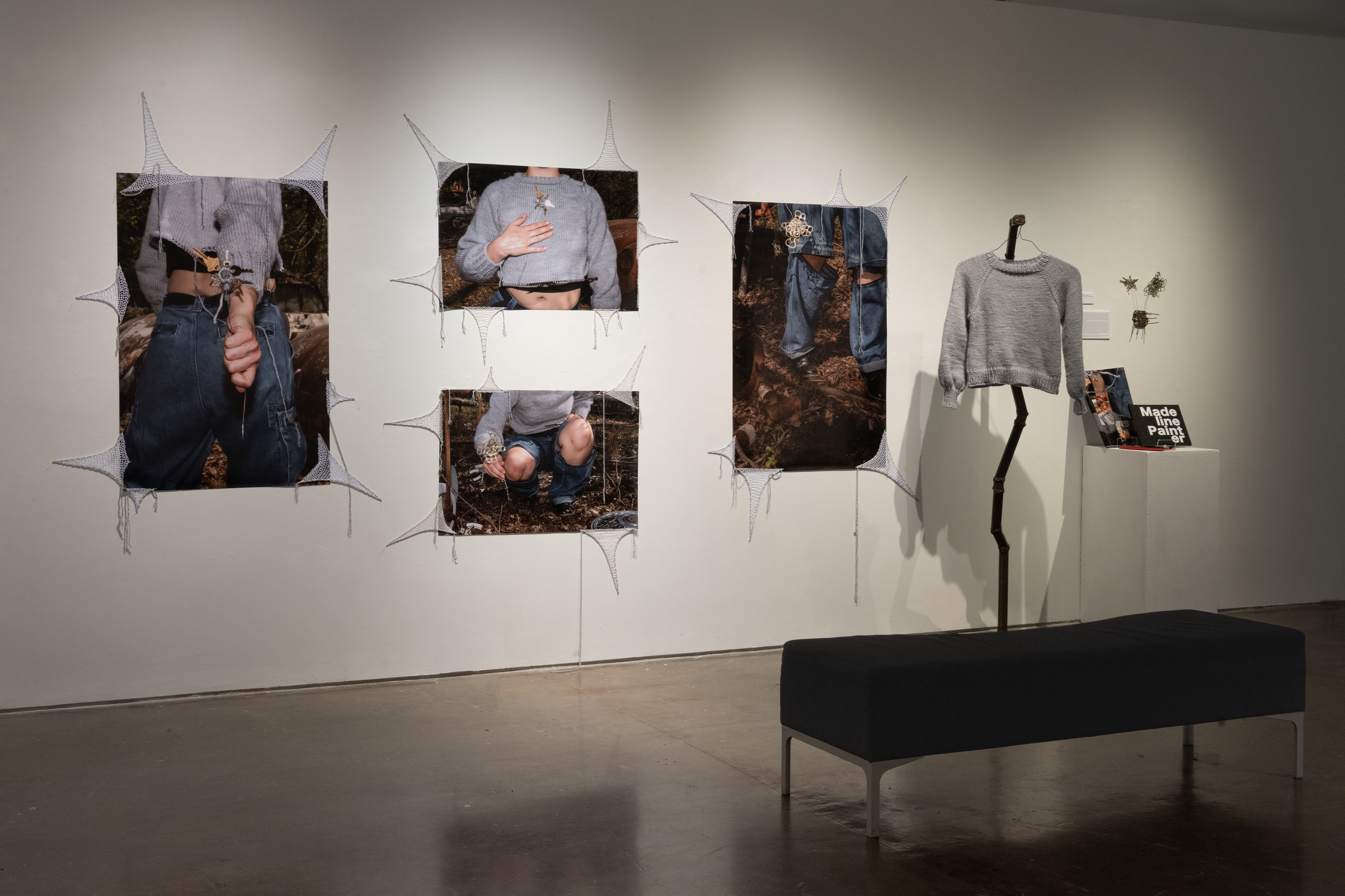 Companionized Corrosion is a multimedia polyptic completed for UGA’s Exit Exhibition in 2025. The four altered photographs, hand knit sweater, and metal sculptures were made by the artist, Madeline. The metal armature was made by Wilson Morris and titled Junktion (71” x 16”, Found Metal)